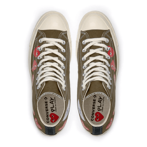 Step up your sneaker game with the CDG PLAY CONVERSE Multi Red Heart Chuck Taylor All Star ’70 High Sneakers, a stylish collaboration between Comme des Garçons PLAY and Converse. Known for their timeless silhouette and playful heart motif, these sneakers bring together premium design and comfort for everyday wear. The standout feature is the multiple red heart graphics scattered along the canvas, instantly adding a bold yet chic touch to your outfit. Whether you’re dressing casually or aiming for a streetwear-inspired look, these sneakers deliver unmatched versatility.